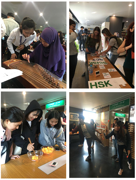 学生们在孔子学院总部参与了丰富多彩的文化体验活动和文化沙龙讲座。学生们首先到达“智慧音乐课堂”,通过老师的现场指导,他们学习了中国传统乐器--古筝的基础指法,并能在短时间内尝试着弹奏出“高山流水”,受到了现场老师们和同学们的高度赞扬。之后,学生们又参与了“探索汉考-畅游中国”有奖活动,包括“LOGO拼图”、“HSK对对碰(道具拼图板)”、“城市元素”、“投壶”、“中国筷子巧使用”等丰富多彩的游戏活动。在游戏中,学生们不仅享受到游戏的快乐,得到了精美的礼物,也收获了丰富的文化知识。最后全体师生聆听了“当今世界全球化”的主题讲座,并与主持人热情互动,提高了对当代中国的认知和理解。