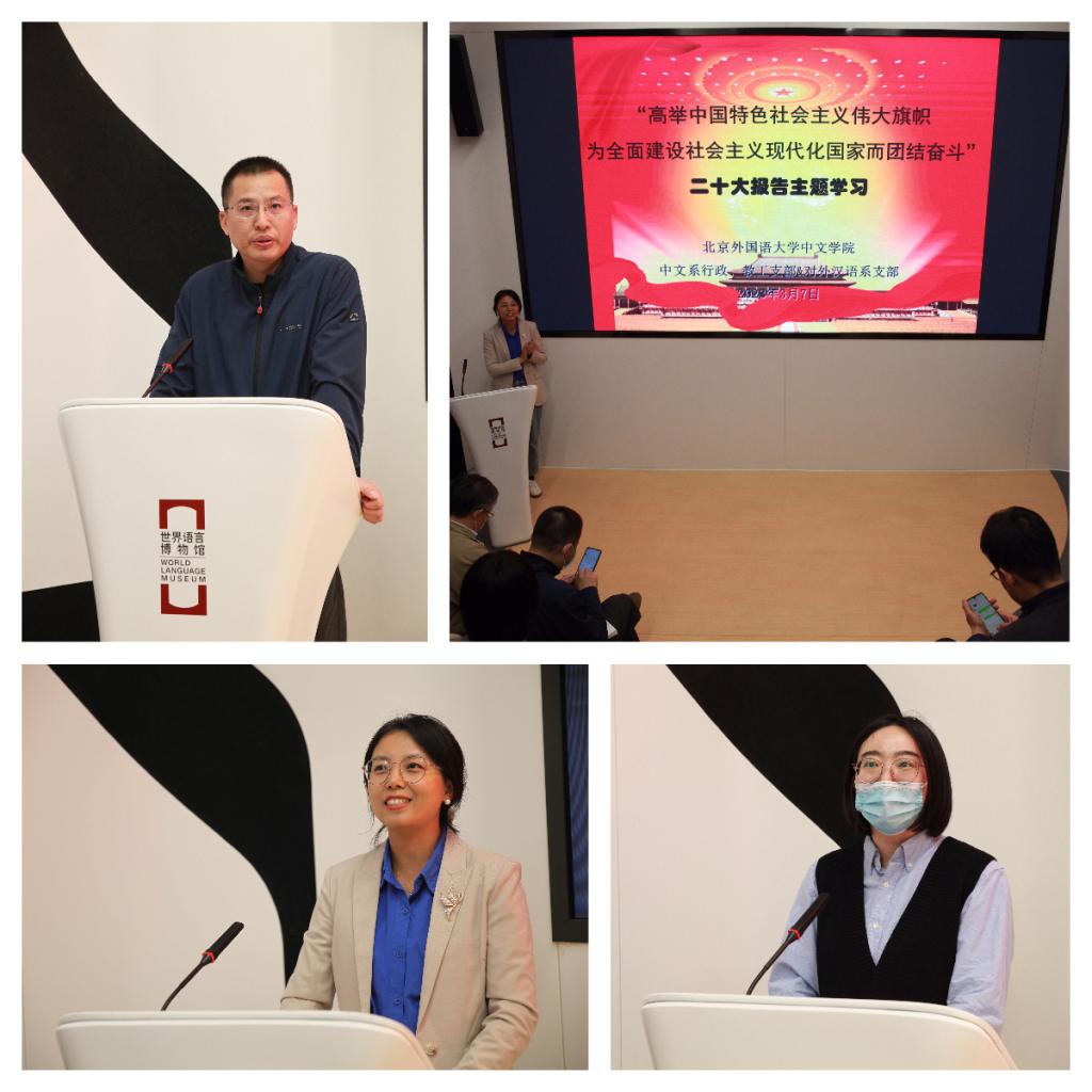 为全面学习领会习近平新时代中国特色社会主义思想和党的二十大精神,必赢242net官网两个教工党支部于3月7日组织党员集体前往世界语言博物馆参观,并在馆内下沉报告厅进行二十大报告主题学习。本次学习由中文系行政教工支部书记罗静主持。