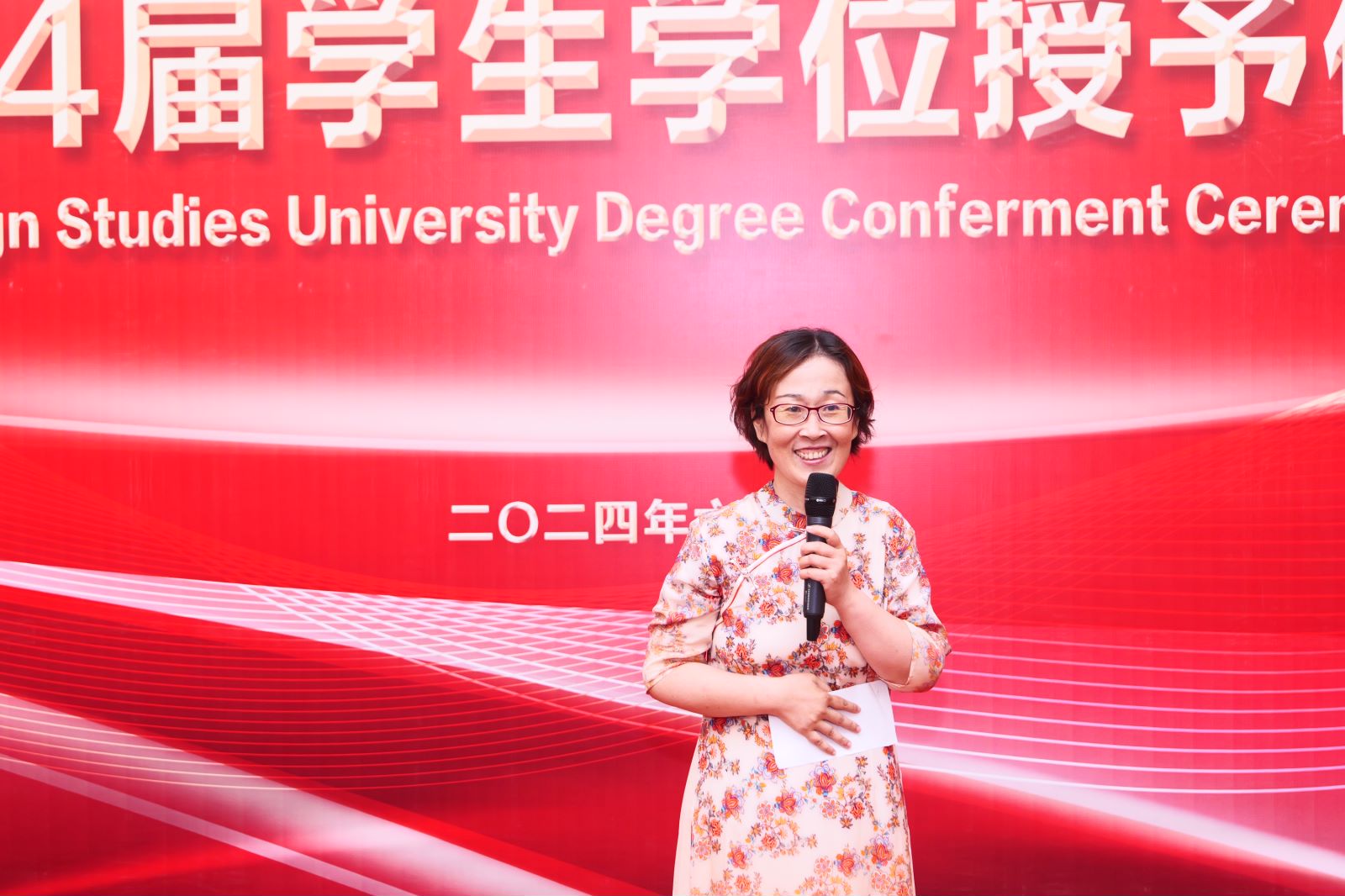 随后,学院教师代表张霖老师上台致辞。她祝贺毕业生们以坚韧的毅力完成了学业顺利毕业。她与在座同学分享了胡适先生的一张“药方”,勉励同学们带着“问题丹”“兴趣散”和“信心汤”,永不停止地自我突破,在人生道路上勇往直前。