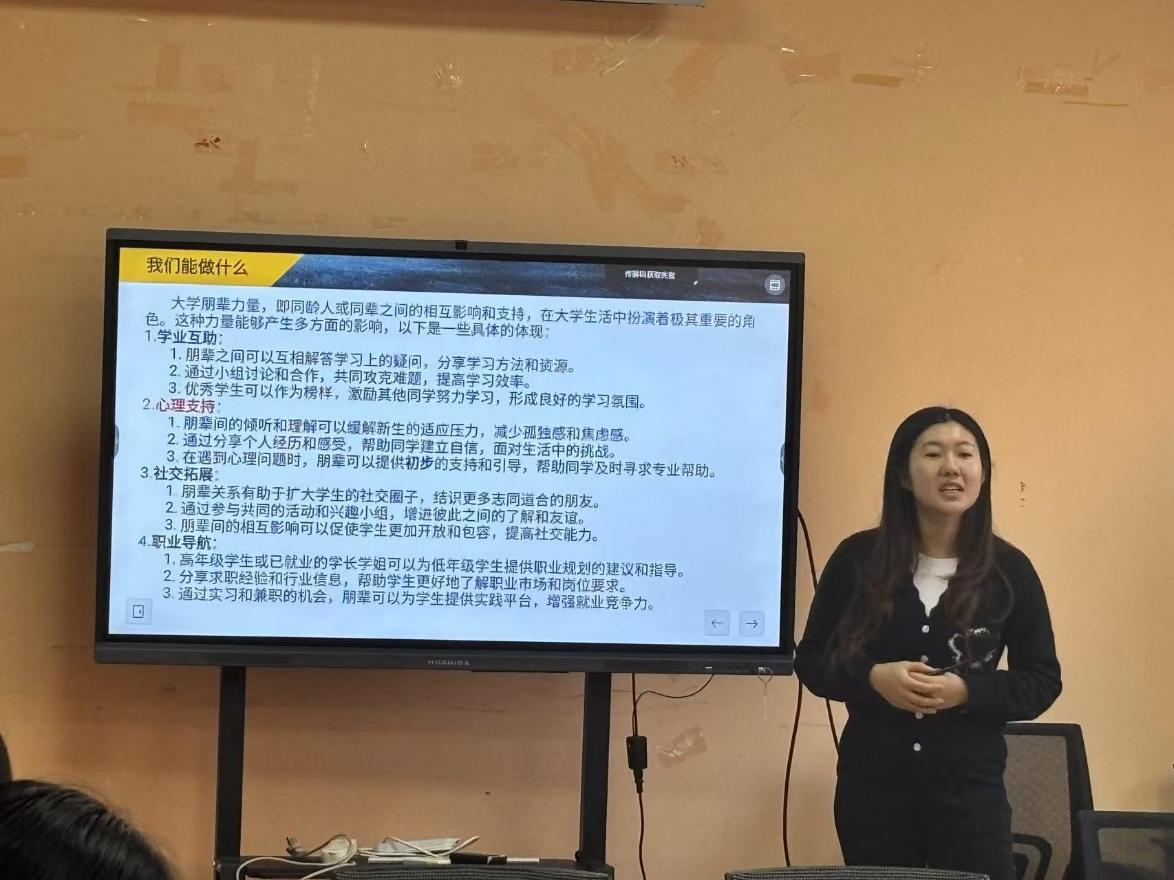 讲座伊始,宋巍老师以“朋辈力量-我们能做什么”为引,指出心理委员作为朋辈伙伴,不仅能够倾听和理解同学们的问题,还能通过共情为同学们提供情绪价值以及心理支持。在发现和处理问题时也具有独特的优势,能敏锐的发现潜在的问题,在关键时刻做好“吹哨人”的工作。随后,宋老师就常见的心理亚健康症状表现、危机评估问题进行详细介绍,旨在帮助心理委员更加精准地进行评估与识别,做好“吹哨人”工作。宋老师还为大家展示了校内校外多种心理资源,鼓励心理委员们加强对班级心理健康知识的宣传和普及,面对有需要的同学提供必要的心理求助资源。最后,宋老师组织各位心理委员进行了一对一实践练习,使各位心理委员熟悉了从“倾听共情”到“简单评估识别”再到“提供资源”的整个流程,为日后在实际工作中高效、准确地开展心理健康服务奠定了坚实的基础。