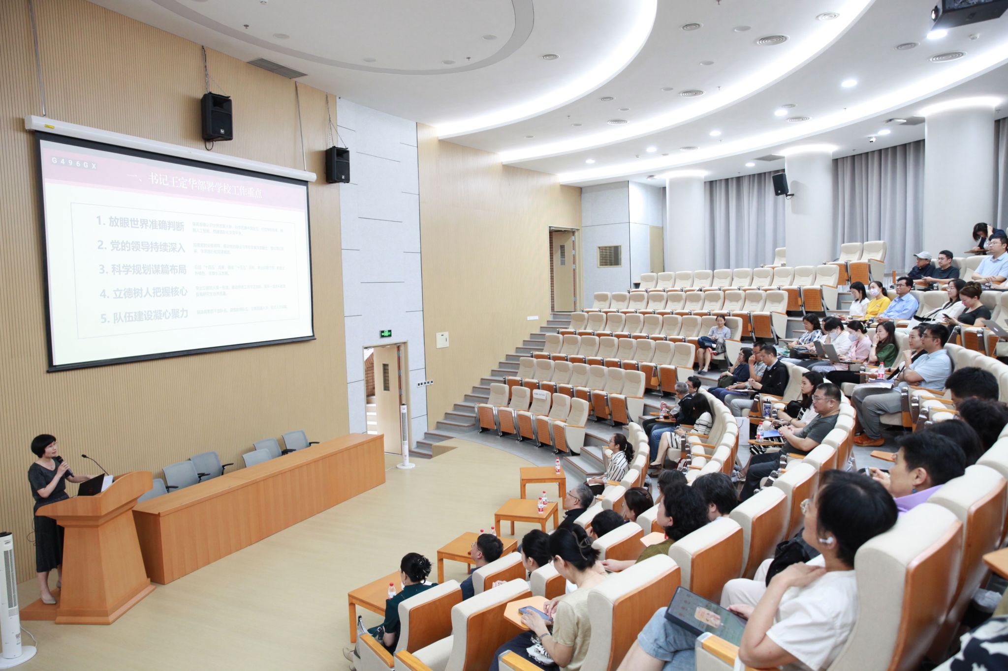 蔡芝芳首先传达了学校党委书记王定华和党委副书记、校长贾文键在新学期工作部署会上的重要讲话精神。王定华书记围绕新学期工作重点强调六个方面的内容:放眼世界准确判断、党的领导持续深入、科学规划谋篇布局、立德树人把握核心、队伍建设凝心聚力、优化治理体制发展。贾文键校长回顾学校近年来取得的成绩,以及学校在人才培养、科学研究、社会服务、国际交流、文化传承创新中的重大成果和面临挑战,结合学校实际提出七个方面的新设想、新举措和新要求。